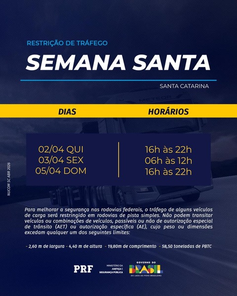 RESTRIÇÃO DE TRÁFEGO - Para aumentar a fluidez do trânsito e diminuir o risco de acidentes, haverá restrição de tráfego para veículos de cargas excedentes, ou seja, que ultrapassam as dimensões máximas permitidas e que precisam de AET (Autorização Especial de Trânsito), apenas em pistas simples, nos seguintes dias e horários: